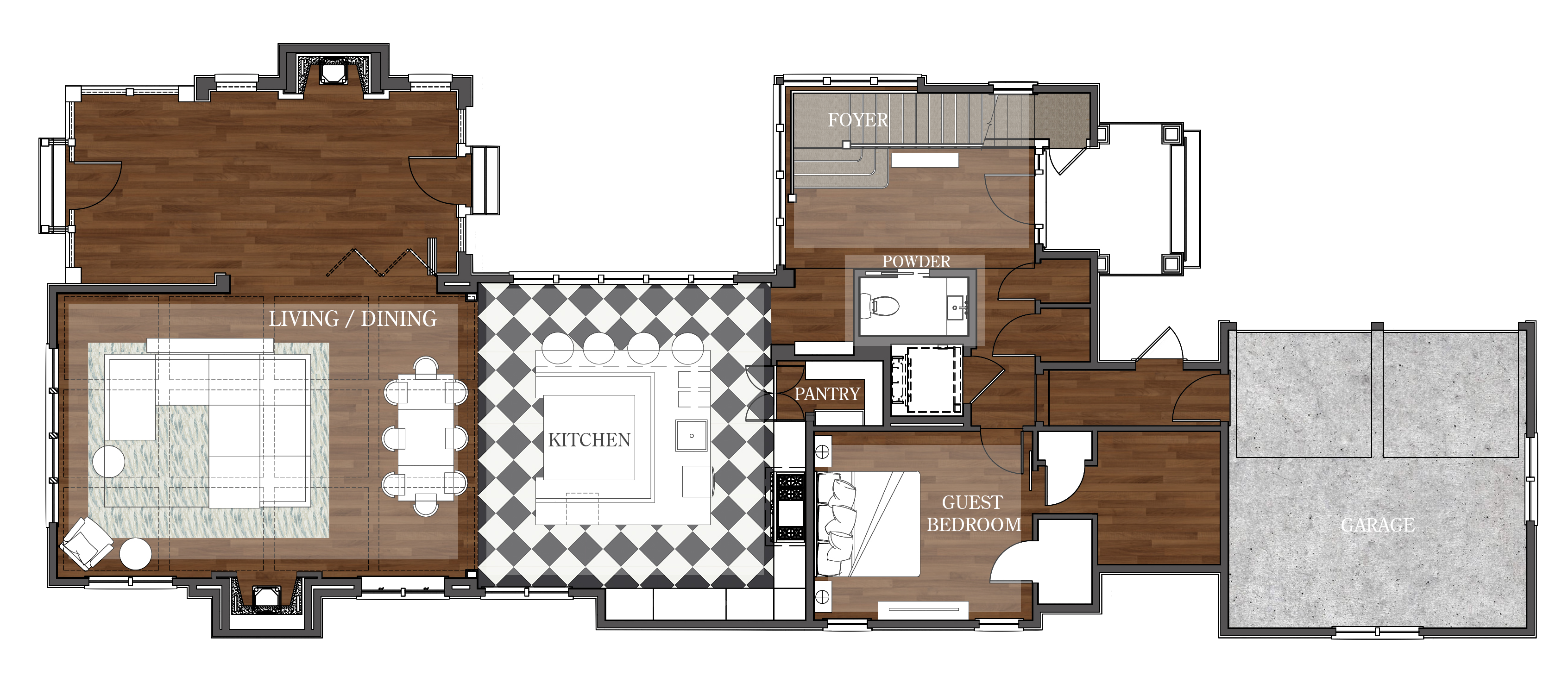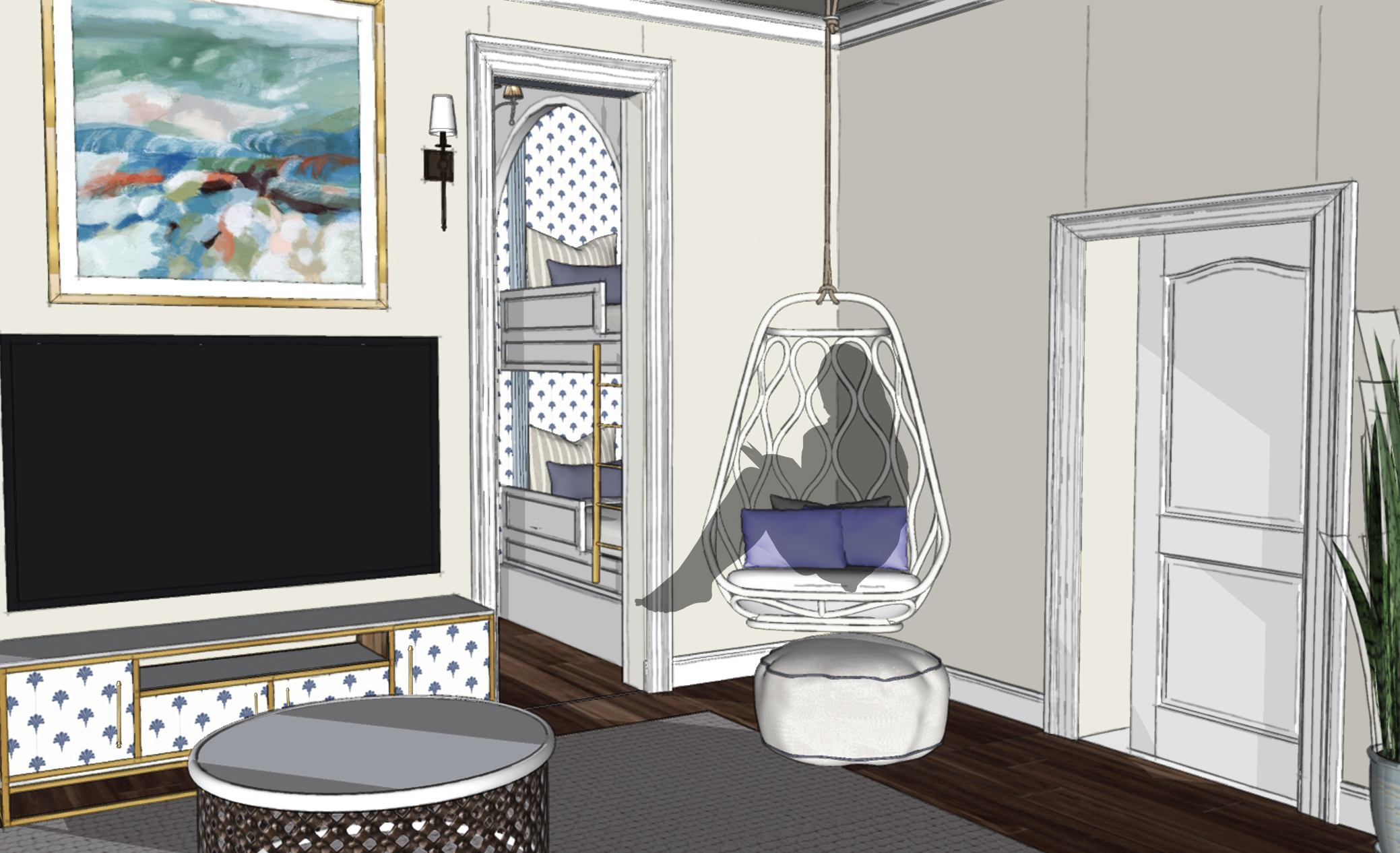 The design for this beach home is to create a space where both the family and tenants feel comfortable yet allured. Thus allowing them to make life long memories in a setting that they can securely indulge in. Natural elements incorporated into the floors and attractive colors allow both the natural and exuberant to align in one home, evoking a sense of the house being united and all encompassing for all those who enter. The home having a personality is a vital aspect to a home, especially when there could be a large number of individuals staying in this place at one time. The design is centered around this need and will include plenty of seating, with a large sectional that’s easily moveable to the home’s needs.